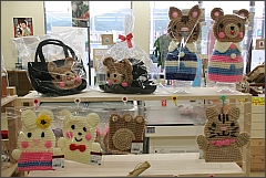 うさぎやクマなどのデザインのカバンやトイレットペーパーカバーなど毛糸の手作り作品。