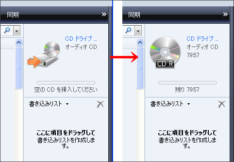 10秒〜30秒ほど待つと、上図のようにメディアプレーヤー右側に空のCDが挿入されたことを認識します。