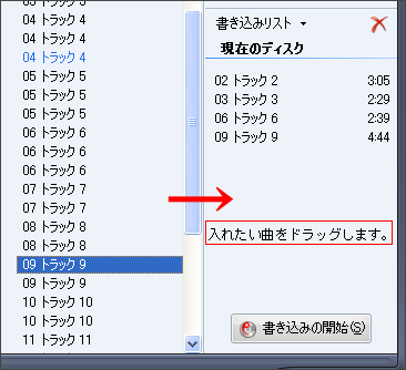 表示された音楽ファイルをメディアプレーヤー右側の「書き込みリスト」の下にドラッグします。
